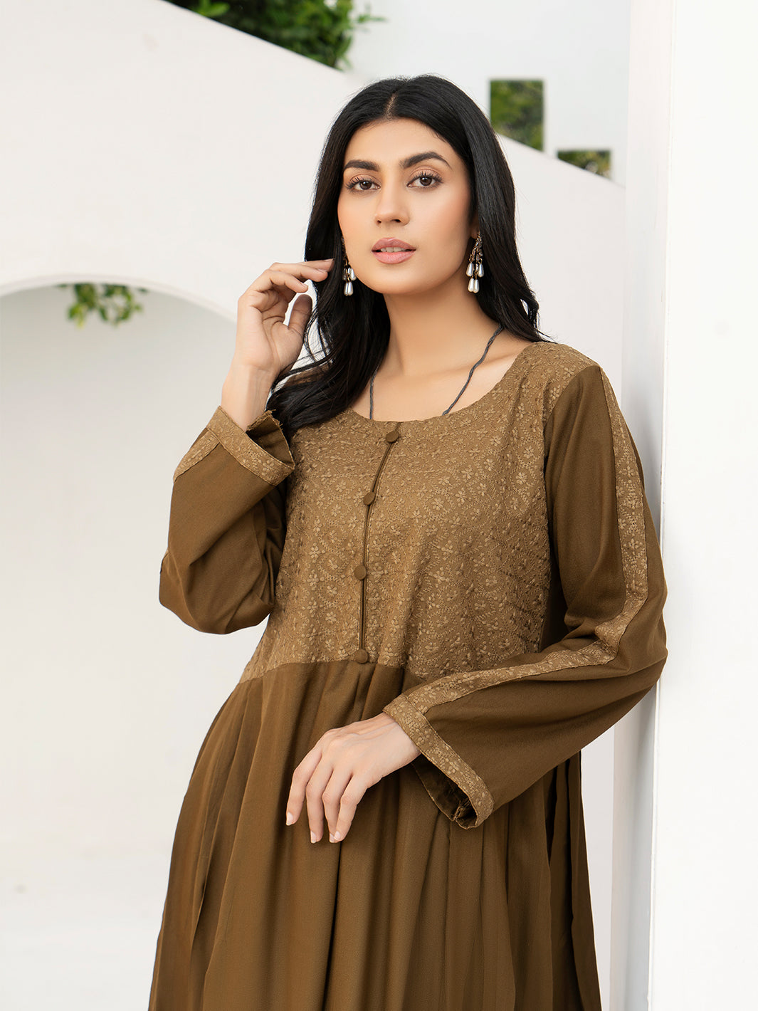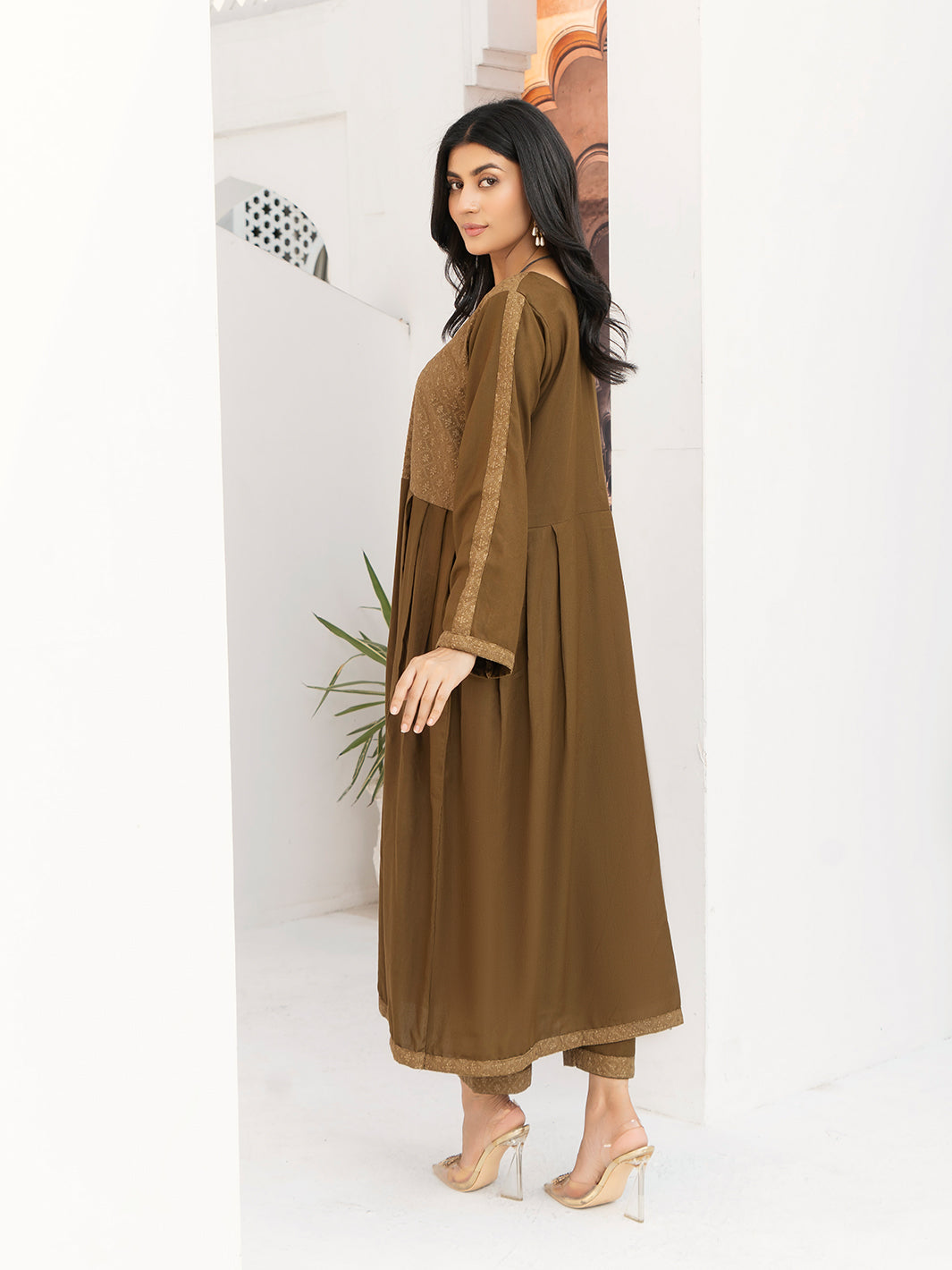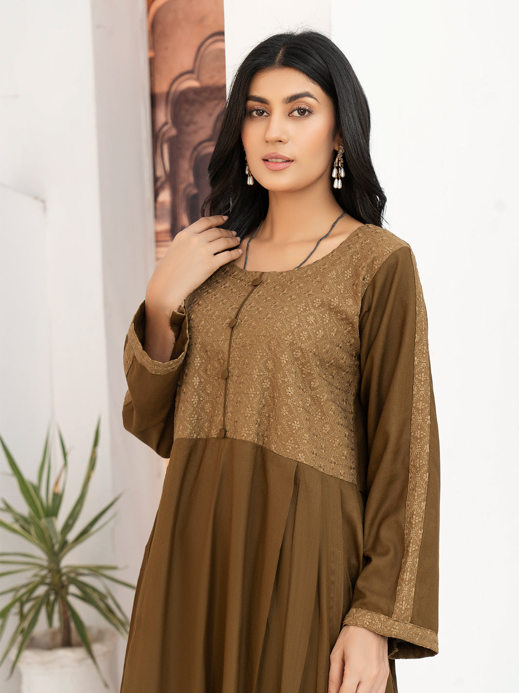 - Elegant brown shirt with intricate Dhanak embroidery for a graceful, winter-ready look