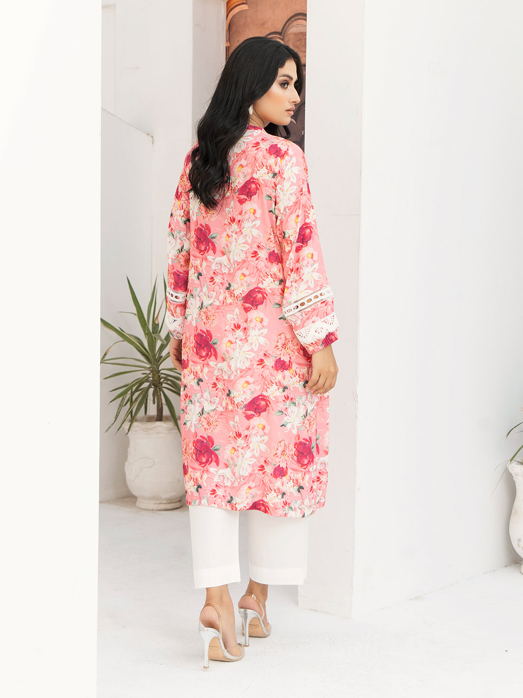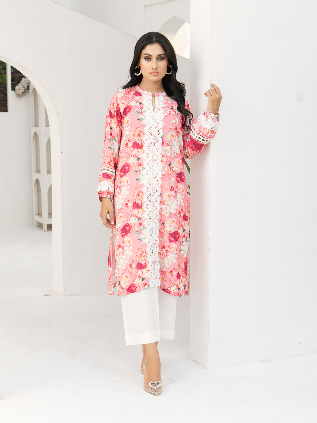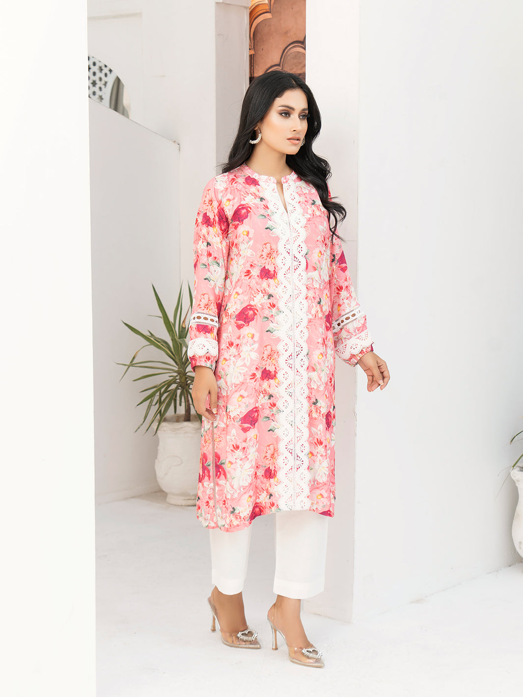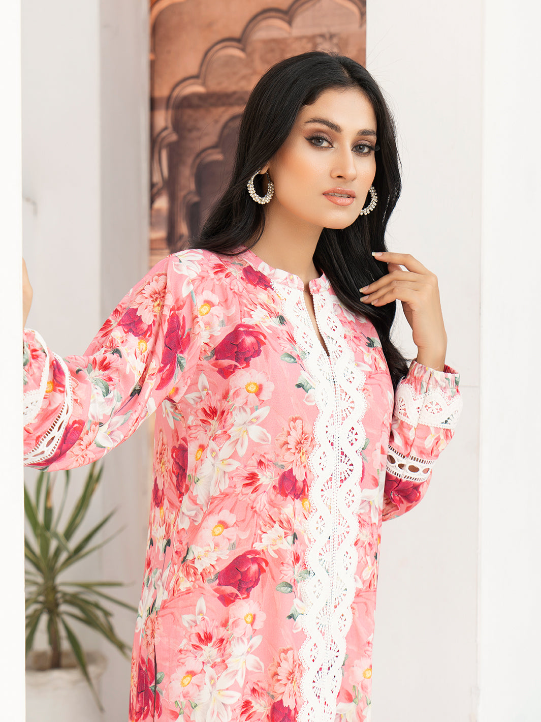 - Pink shirt with a beautiful, detailed print for a fresh and Lace Work for stylish look