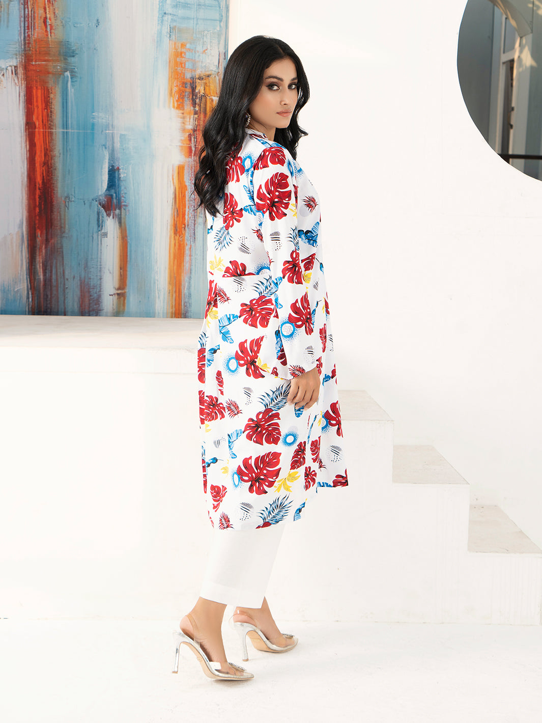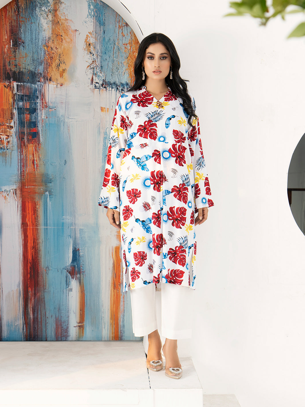 - Plain white trousers to complement the printed shirt