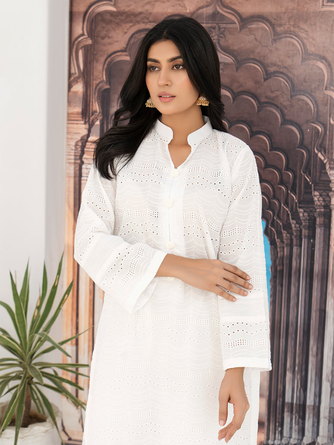 - White shirt with intricate chicken kari embroidery, adding a delicate, timeless touch